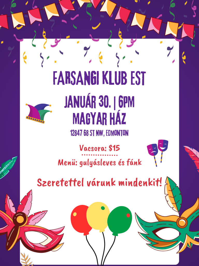 Farsangi klub est Event date: 2026.01.30. 18:00 - 23:00Categories: Események 🇭🇺 Szeretettel várunk mindenkit farsangi klub estünkre a Magyar Házba! Január 30.,18 óra Menü: gulyásleves és fánk Vacsora: $15 🇬🇧 Everyone is warmly welcome to our carnival club night at the Hungarian House! January 30, 6PM Menu: goulash soup and donuts Dinner: $15