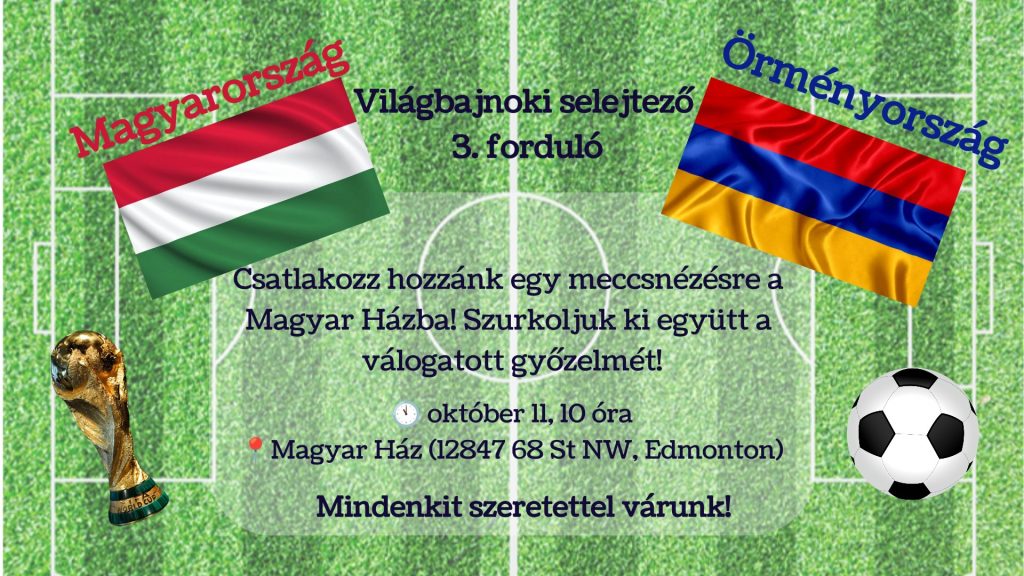 Let’s cheer together for the national team’s victory in the World Cup qualifier! With a win, Szoboszlai and his teammates can take a big step toward next year’s World Cup, which will be held partly in Canada! Kick-off: October 11, 10. am! Let the cheers of “Mindent bele!” roar at the Hungarian House!