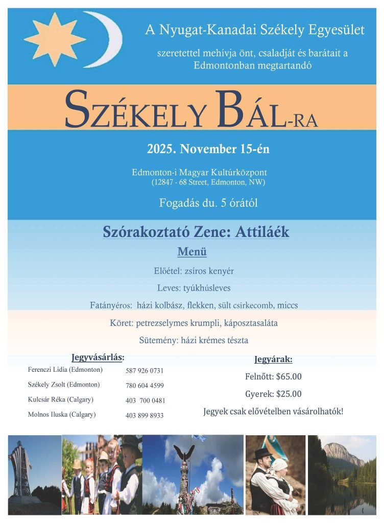 A Nyugat-Kanadai Székely Egyesület szervezésében november 15-én, délután 5 órai kezdettel kerül sor az idei Székely bálra a Magyar Házban! Szeretettel várunk mindenkit egy felejthetetlen estére, Székelyföld ízeivel és hangulatával! Jegyek csak elővételben kaphatók!